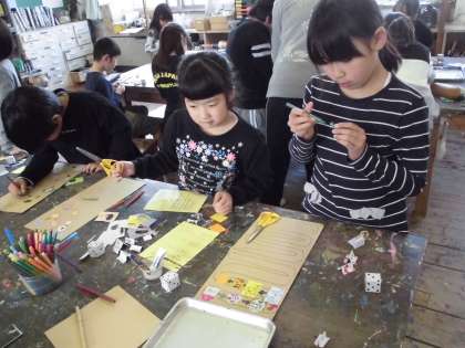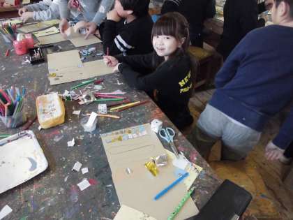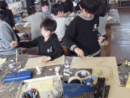 紙をいっぱいつなげて、すごろくゲームを作りました。