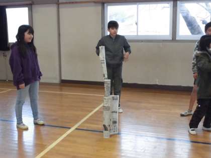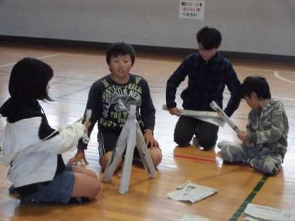 お題は、新聞紙5枚だけで、自立するタワーを作成。