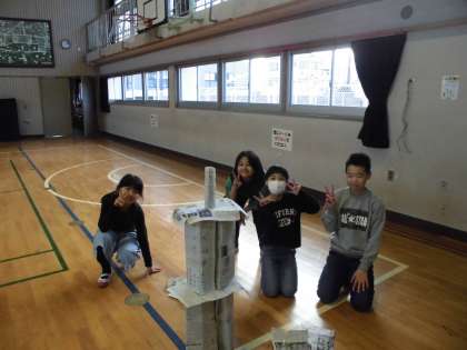 お題は、新聞紙5枚だけで、自立するタワーを作成。