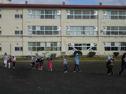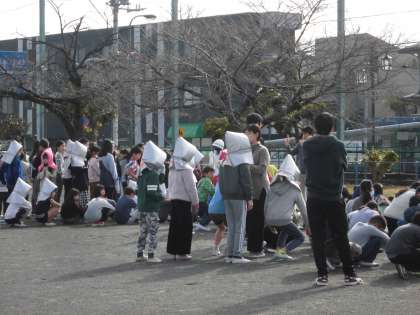 校舎に居た子どもたちは、防災頭巾をして出てきました。