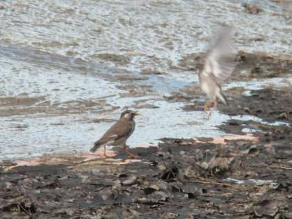 6月8日、今年の水泳指導のために水をぬいたプールの底で、3匹のムクドリ(ムクドリ類ムクドリ科)がえささがしをしていました。