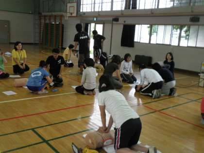 6月15日から始まる水泳指導と日常の「緊急時対応」に備え、救急救命法の講習会を実施しました。今年度は、第九小学校の先生方と一緒に、本校の体育館で、6月10日に実施しました。