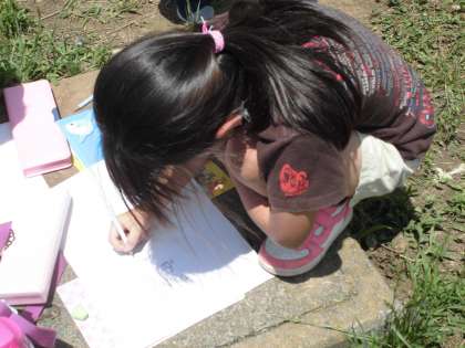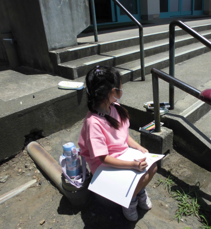 校庭に出て、聞こえた音を、絵で表現していました。