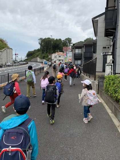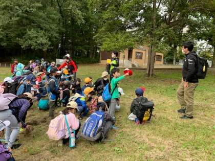? 小宮公園に到着しました。でもまだ広い公園の端、ひよどり山中学校が見えています。ここまで、2年生がリーダーとしてグループみんなに心を配り、安全に気をつけて歩いてきました。