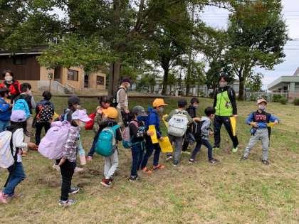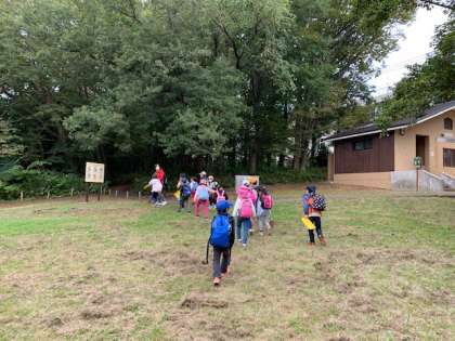 広場で耳をすませて自然の音探し。トイレを済ませ、各班に分かれて小道を散策します。