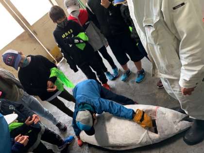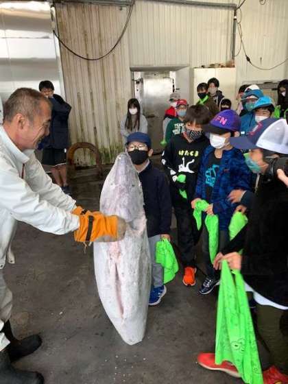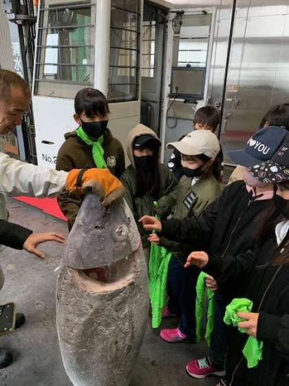 冷凍庫からマグロを出してくれました。みんな触ったり持ち上げてみようとしたりと、チャレンジです。