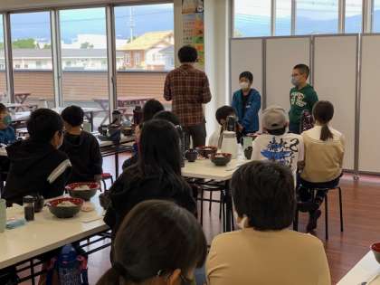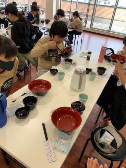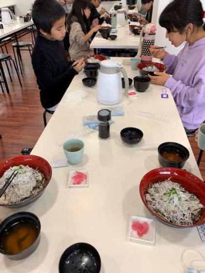 しらすづくりについて学習した後、釜揚げしらす丼の昼食です。朝食からあまり時間が経ってなかったので少し心配しましたが、「東京のスーパーのしらすとは味が違う。」と醤油をかけず頬張っていました。