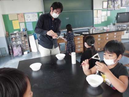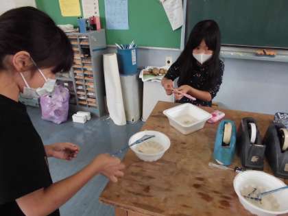 夏から飼育していた蚕の繭から、糸をとりだします。