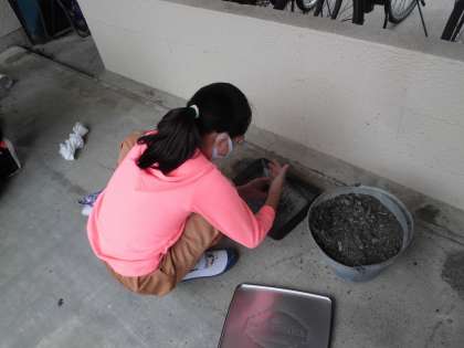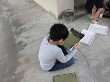 外通路では、空き箱に砂利を入れて、音を確かめていました。