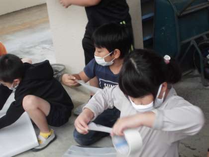 図工室では、大きな紙筒に、らせん状にくぎを打っていました。