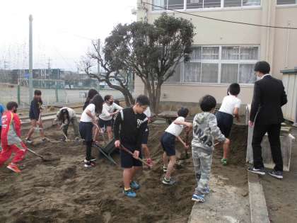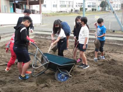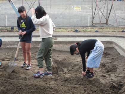 勢いよく水を流し、崩れていくところを、必死に修復していました。
