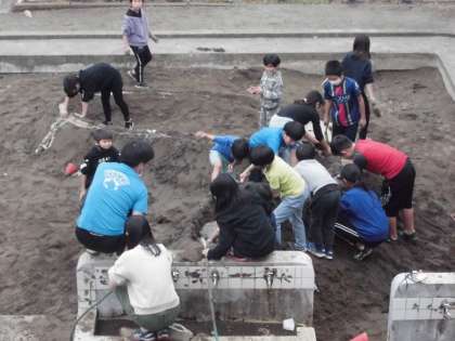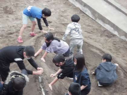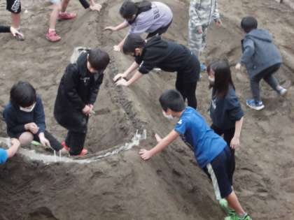 勢いよく水を流し、崩れていくところを、必死に修復していました。