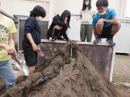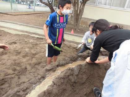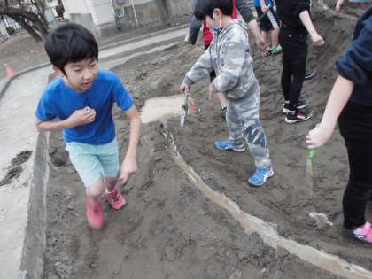 勢いよく水を流し、崩れていくところを、必死に修復していました。