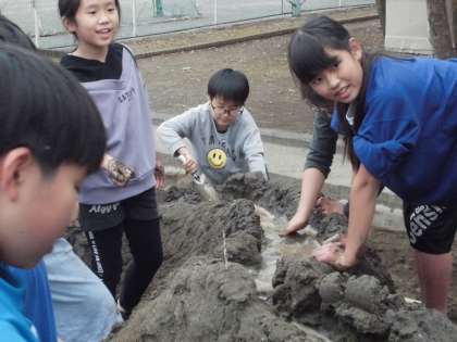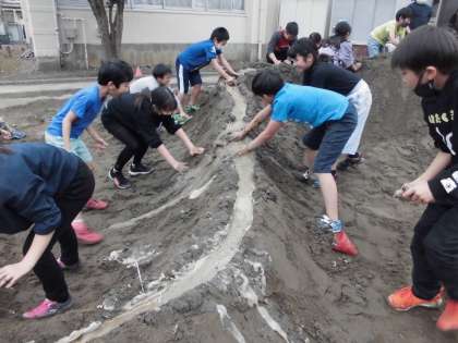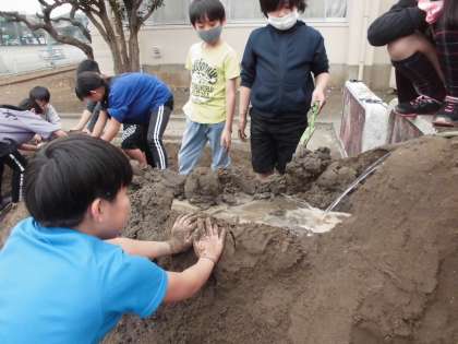 勢いよく水を流し、崩れていくところを、必死に修復していました。