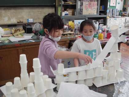 紙コップを使って、ビルのような建物や