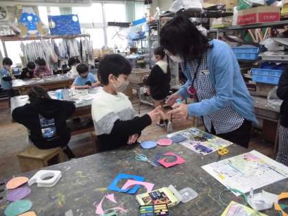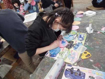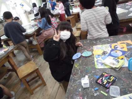 丸い紙を透明な紐につけ、パステルで絵を描き、一番下に鈴をつけました。