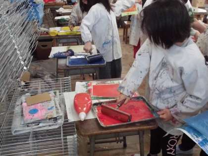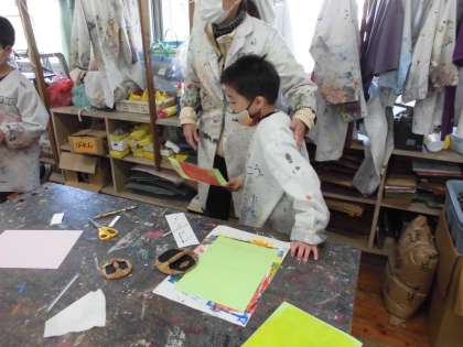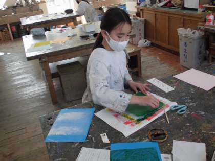 もらった作品をよく見て、上に重ねる色、模様を考え重ね刷りをする。