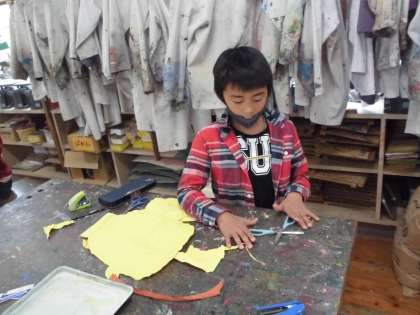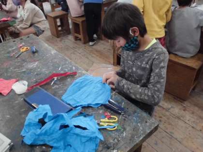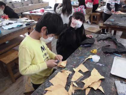 顔の形に切り周りをホチキスでとめ、ひっくりかえす。