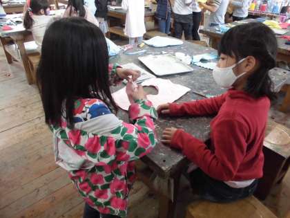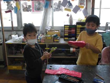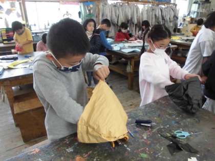 顔の形に切り周りをホチキスでとめ、ひっくりかえす。