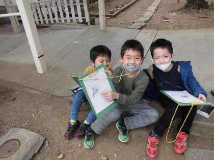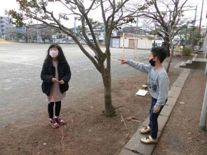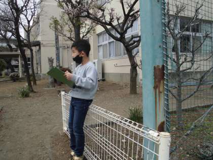 校庭で、植物の観察をしたり、花に水をあげたり、