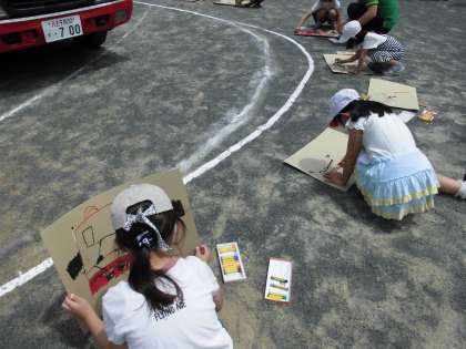 消防車が2台来てくれました。子供たちは間近で写生ができました。