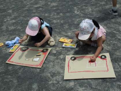 細かいところまでずっと描いている子、消防士さんとのお話に夢中な子