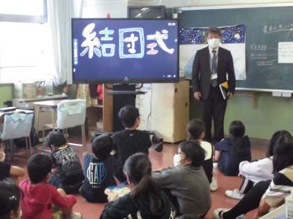 結団式をしていました。校長先生、引率の先生のお話を聞きました。