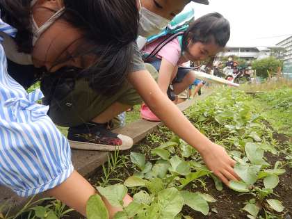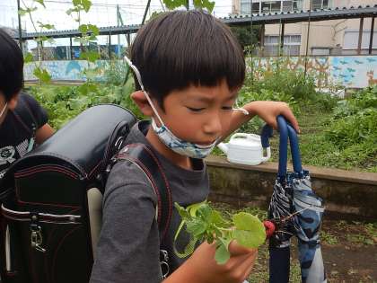 総合的な学習の時間「野菜はかせになろう」の学習で育てている畑の野菜がどんどん育ってきてます。みんな嬉しそうに収穫していました。