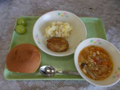 切り込みの入った丸パンに、照り焼きチキンとポテトカルボナーラをはさんで食べました。