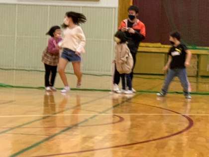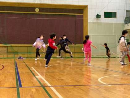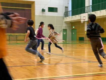 体育館でのレクレーションタイム。初めは、尻尾取りゲームです。