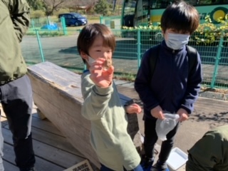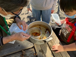 散策チームのどんぐりは、お湯で洗って虫や汚れを取って、乾かします。カマキリのたまごは、洗いません。