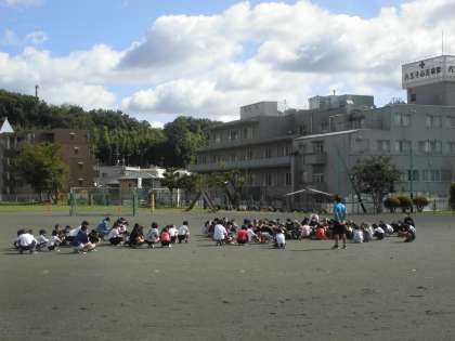 校庭で遊んでいる子どもたちは、すぐにしゃがんでいました。