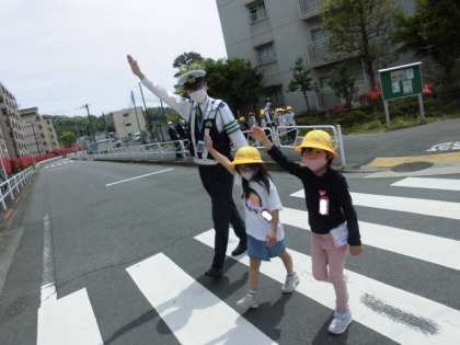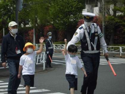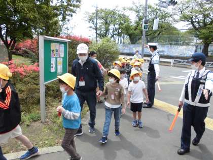 横断歩道の渡り方、歩道の歩き方など指導を受けながら
