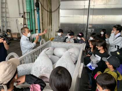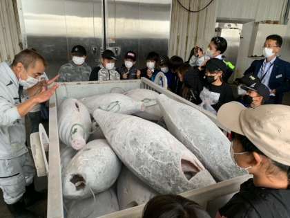 2〜3日後さらに出されるメバチマグロ。50kg〜100kgの重さなんだそうです。実際に、触らせてもらいました。カチカチに凍ってます。