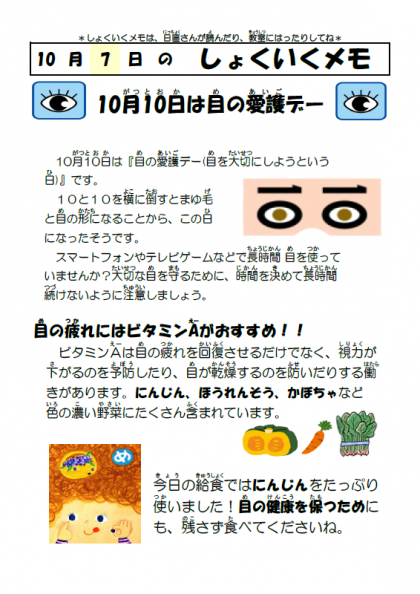 少し早いですが、10月10日の「目の愛護デー」にちなんで、目の健康を保つ働きがあるビタミンAがたっぷりの人参ごはんをいただきました。人参ごはんは、岩本先生の元気応援メニューでもあります!この機会に皆さんの視力が下がらないように、目の健康について考えていきましょう!