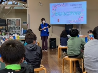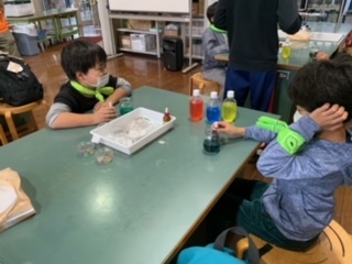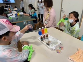 化学実験室で、ふわもこアロマ作りです。まず色水を混ぜて好きな色を作ります。