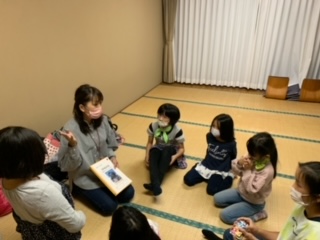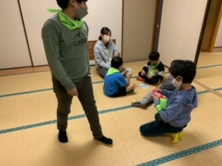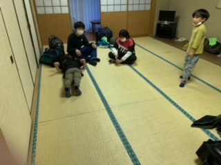 避難訓練を済ませ、空いた時間を広い(24畳)部屋で、カードゲームなどで楽しんでいます。