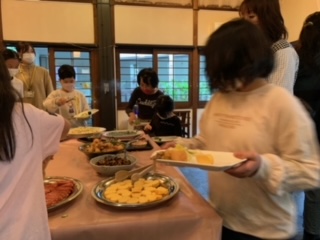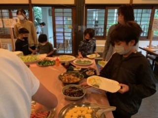 今朝の食事は、バイキング。時間差をつけて取りに行くので、いただきますはグループごとに。