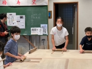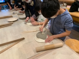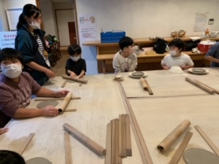 他方のグループは、陶芸教室。粘土を丸く平らにし、型に押しつけお皿の形にします。