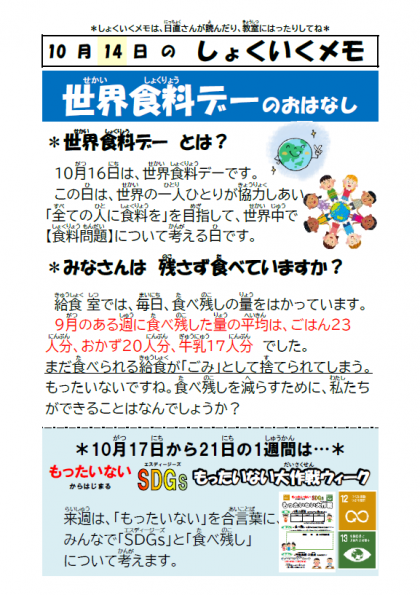 10月16日は、世界の一人ひとりが協力しあい「すべての人に食料を」を目指して、世界中で食料問題について考える「世界食料デー」です。来週の1週間は「もったいない」を合言葉に、みんなで「SDGs」と「食べ残し」について考える「もったいない大作戦ウィーク」に取り組みます。