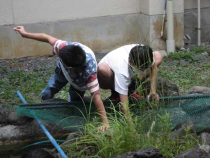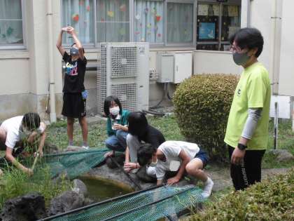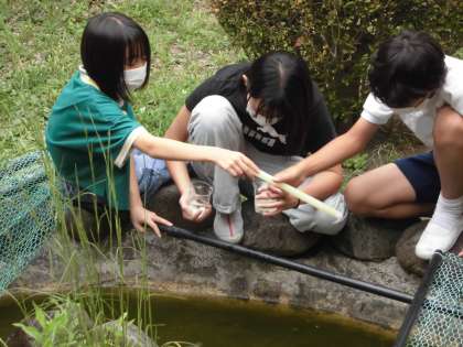 池の水を採取し、顕微鏡で微生物を観察しました。