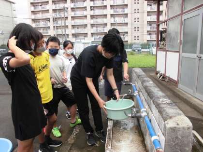 洗濯の学習をしました。洗濯機を使わず、洗濯板を使って手洗いです。