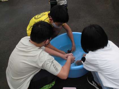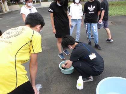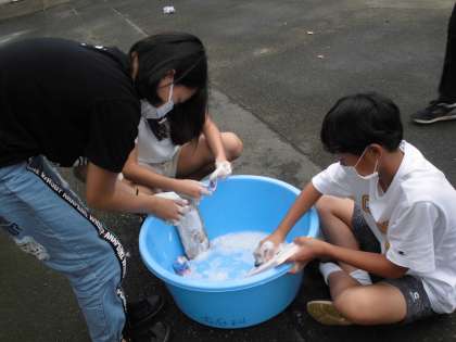 洗濯の学習をしました。洗濯機を使わず、洗濯板を使って手洗いです。