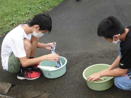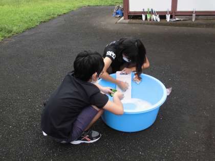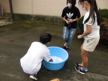 洗濯の学習をしました。洗濯機を使わず、洗濯板を使って手洗いです。