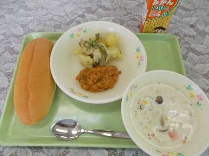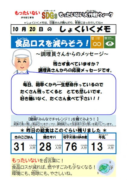 「もったいない大作戦ウィーク」中で、食べ残しを減らすために行動目標を達成するように取り組んでいるところですが、昨日は残念ながら食べ残しが多かったです。9月と比べると、ごはんは8人分、おかずは32人分多かったです。牛乳は、4人分減っていました!