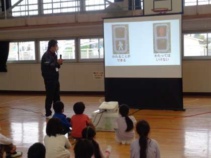 1年生を対象に、道路の歩き方や、どんな所を注意すべきか