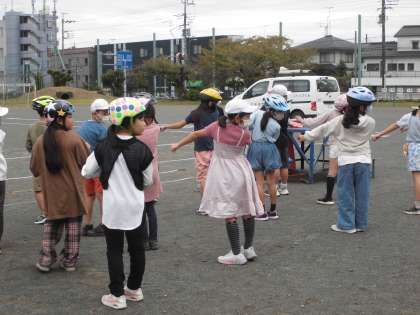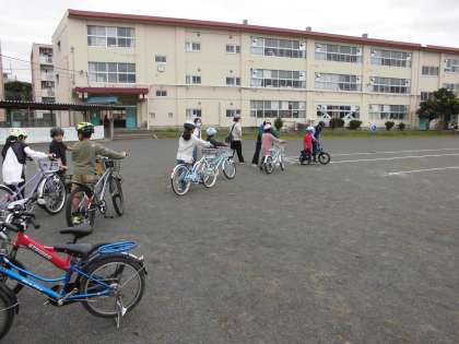 はじめに校庭で注意を聞き、実際に自転車に乗り、