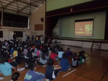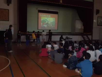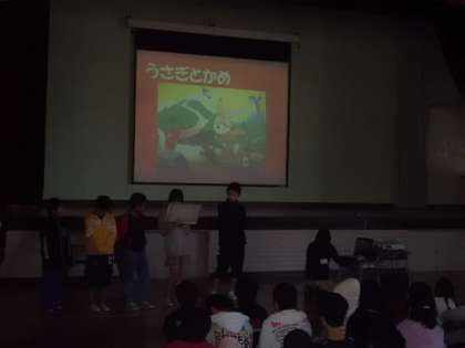 10月27日より11月9日までは秋の読書週間です。本校では、毎週、火曜日、水曜日、金曜日と朝の読書タイムを設け、日頃からの読書活動を推進しています。10月27日日の児童集会では、図書委員会の児童が読書の楽しさを「うさぎとかめ」の童話を題材にして、クイズなどを通して、読書の楽しさを発表しました。