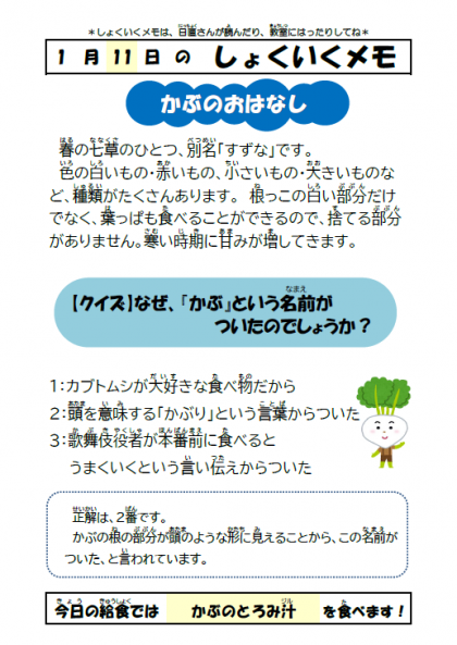 春の七草のひとつ「すずな(かぶ)」を使ったとろみ汁をいただきました。
