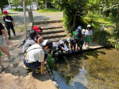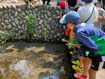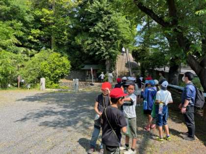 坂を下ると何があるでしょう?の答えは、子安神社でした。湧水の池では、ザリガニを見つけ、大騒ぎになりました。掃除する方がいらっしゃいました。綺麗な環境を保っていきたいものです。